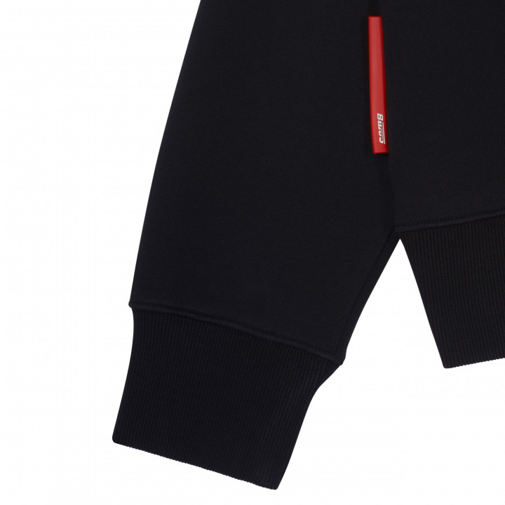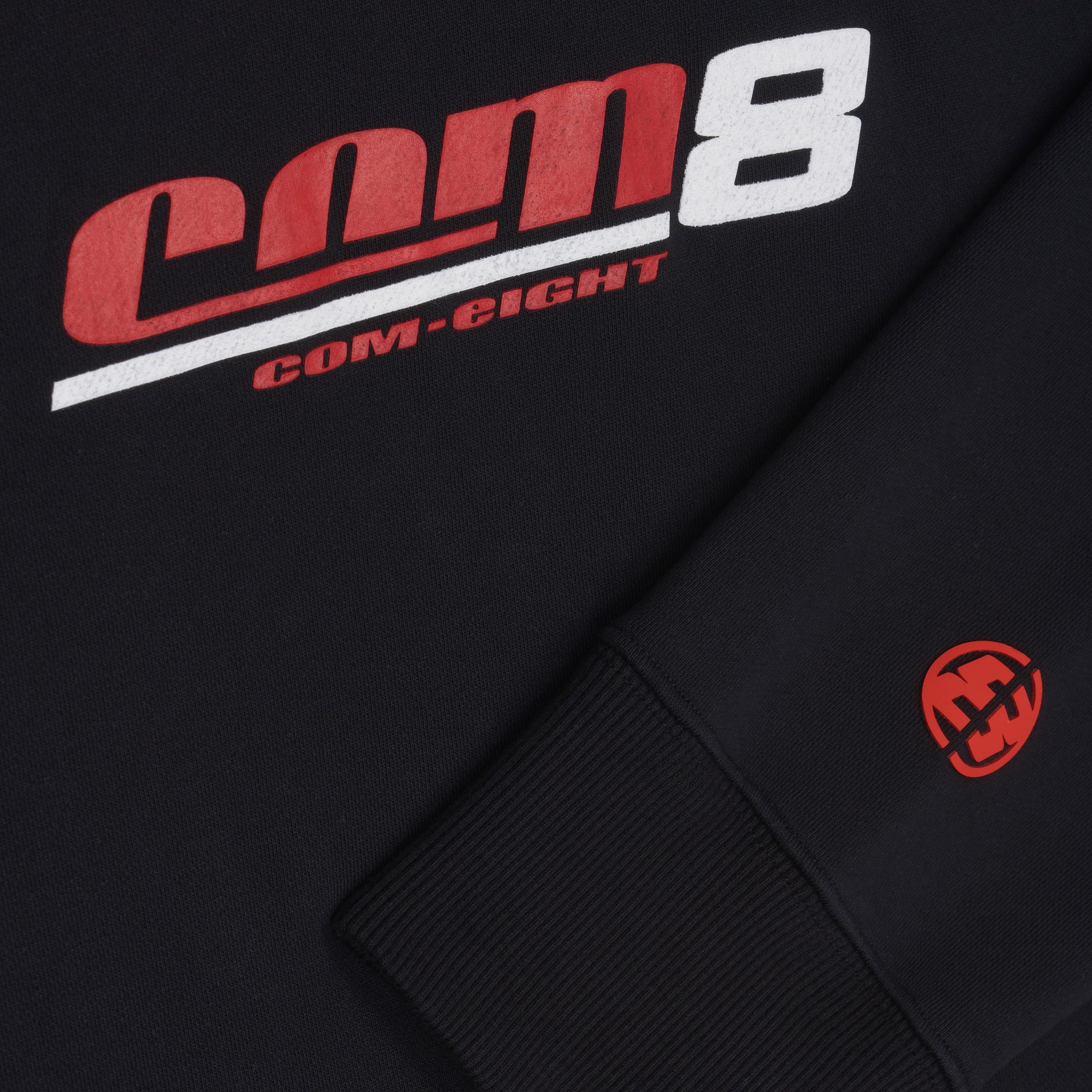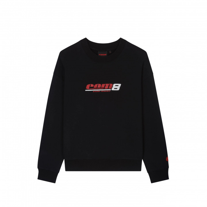 COM-EIGHT HERITAGE LOGO CREWNECK IN BLACK. MADE IN PORTUGAL. FEATURES 100% COTTON 360gr USED FRENCH TERRY, LOGO COLLECTOR 98 SCREEN PRINT, RIB KNIT CUFFS & WAISTBAND.