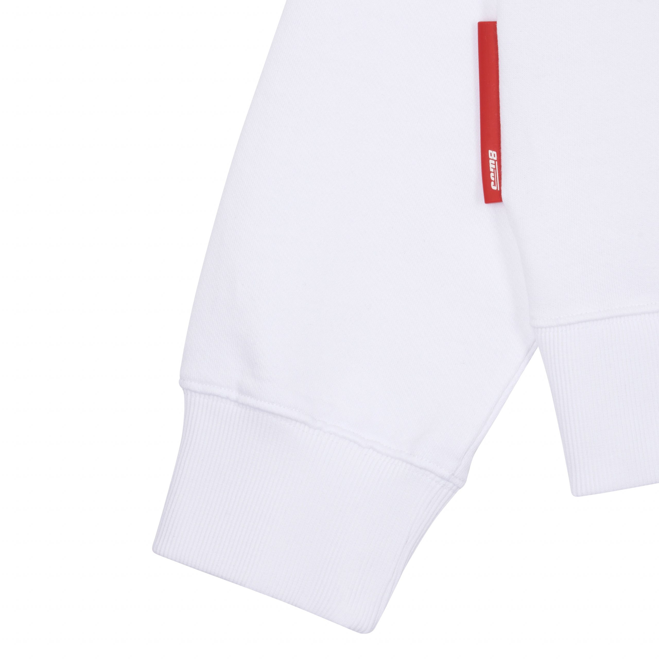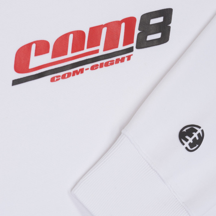 COM-EIGHT HERITAGE LOGO CREWNECK IN WHITE. MADE IN PORTUGAL. FEATURES 100% COTTON 360gr USED FRENCH TERRY, LOGO COLLECTOR 98 SCREEN PRINT, RIB KNIT CUFFS & WAISTBAND.