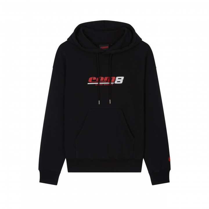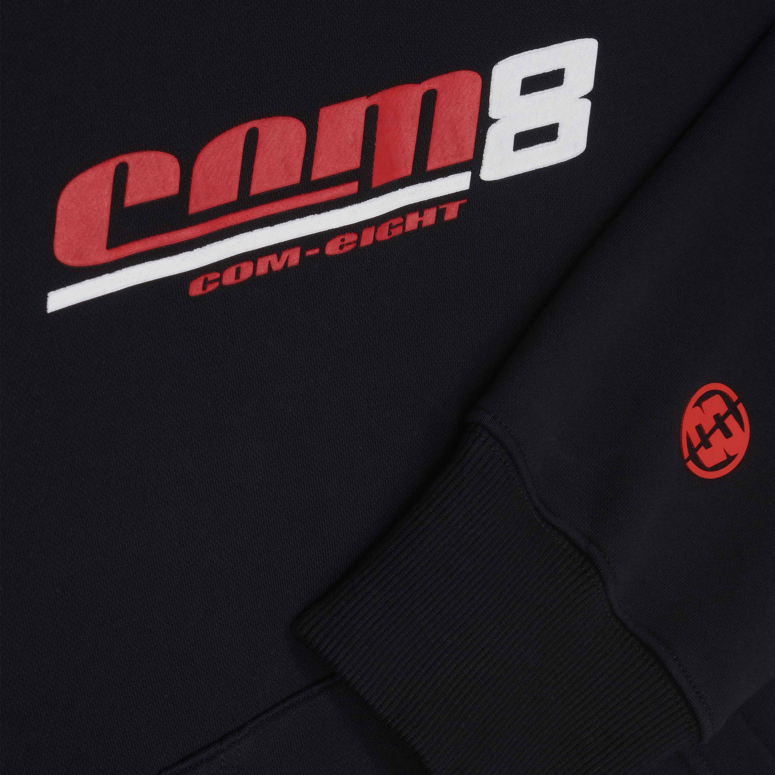 COM-EIGHT HERITAGE LOGO HOODIE IN BLACK. MADE IN PORTUGAL. FEATURES 100% COTTON 360gr FRENCH TERRY,