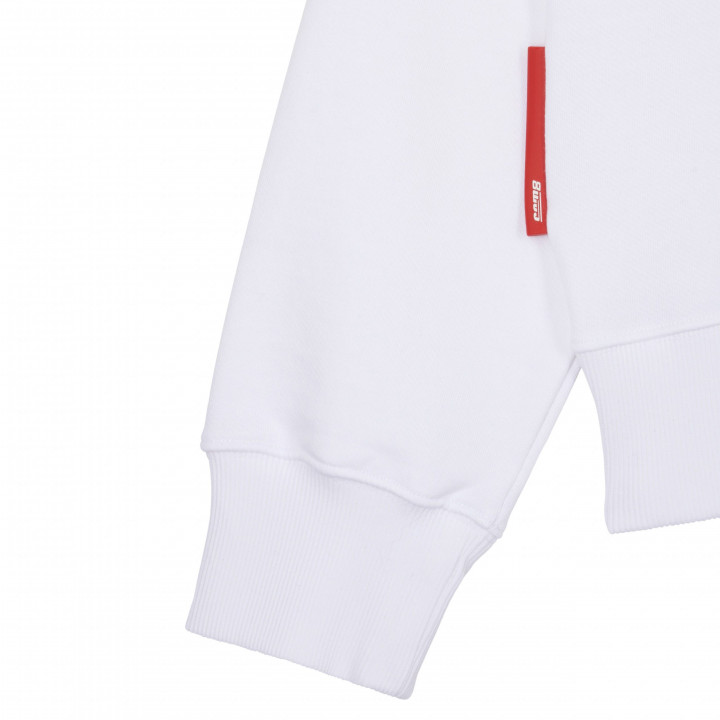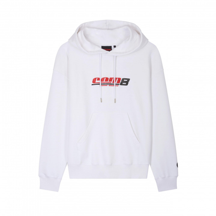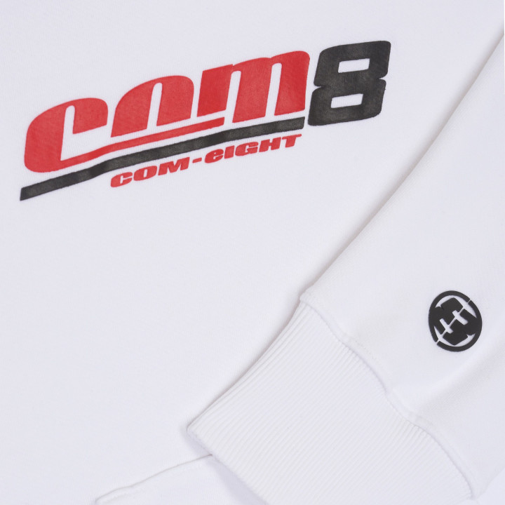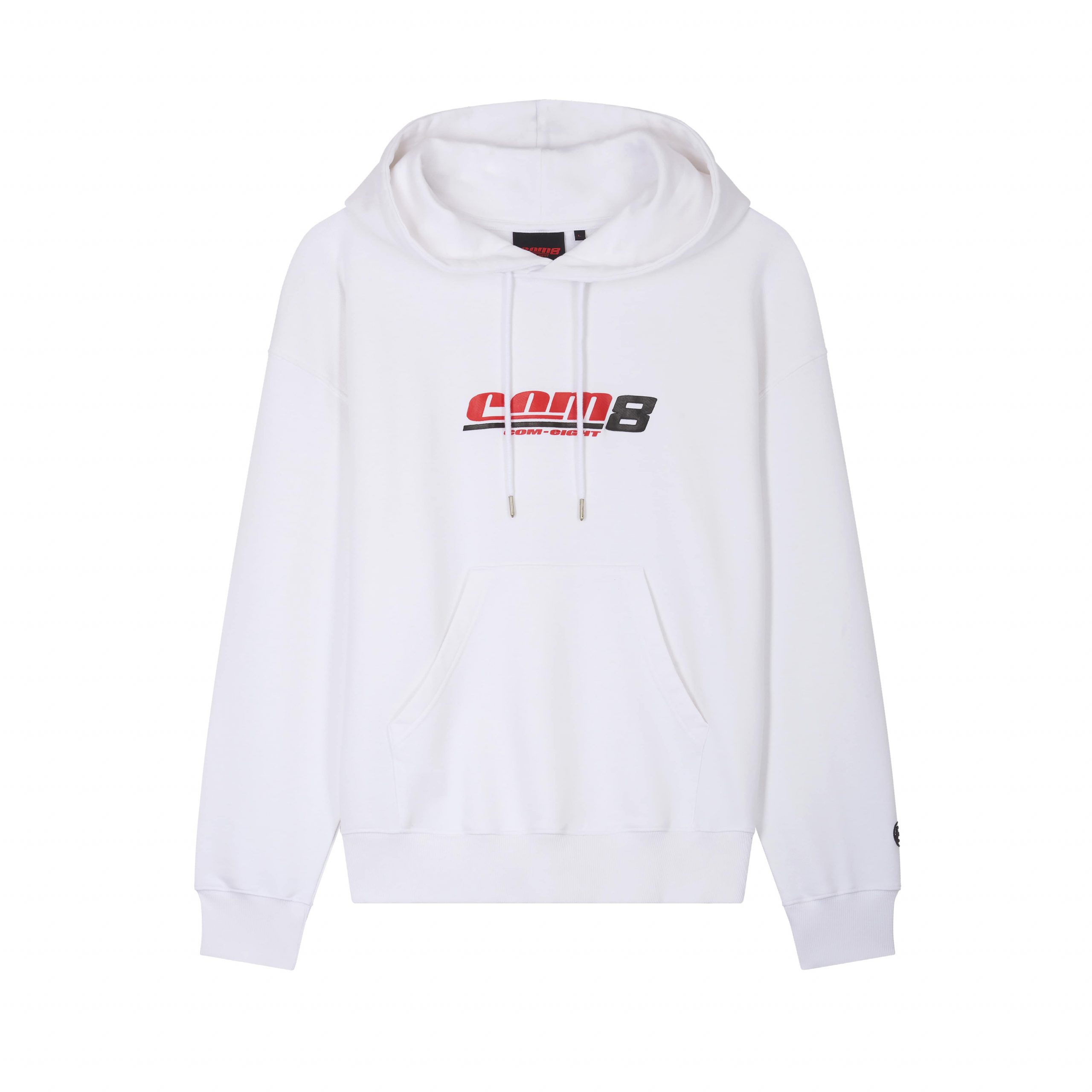 COM-EIGHT HERITAGE LOGO HOODIE IN WHITE. MADE IN PORTUGAL. FEATURES 100% COTTON 360gr FRENCH TERRY,